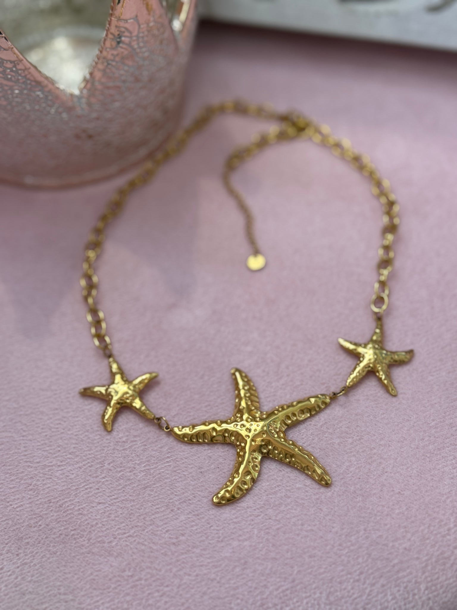 Expertly crafted from high-quality stainless steel, this Starfish Necklace is the perfect addition to your jewelry collection. The necklace features 3 intricately designed starfish pendants, each plated with 18K gold for a touch of elegance. Add a touch of the ocean to your everyday look with this stunning necklace.