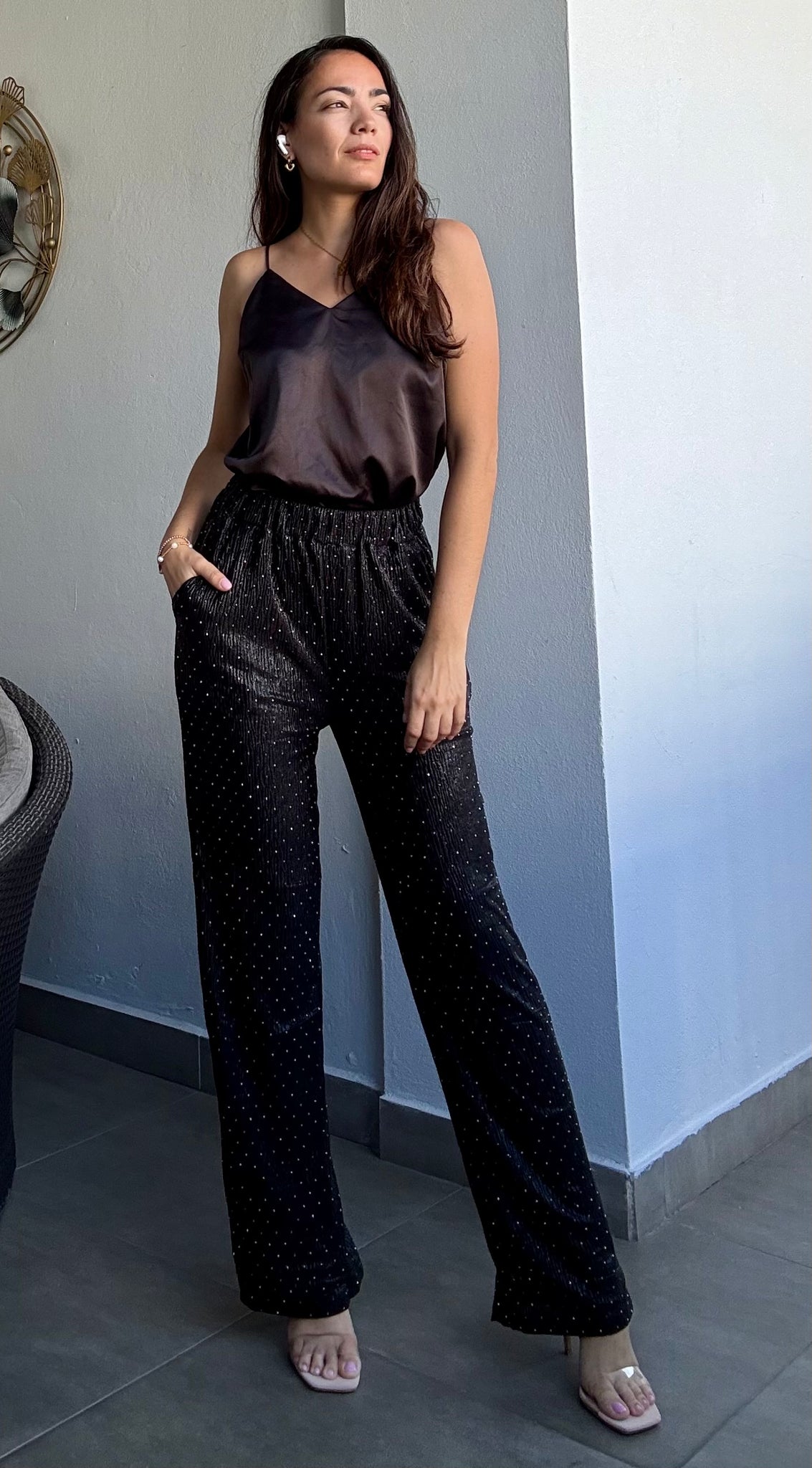Enhance your wardrobe with our Black Straight Glitter Pants. Featuring stylish studs, an elastic waist, and convenient front pockets, these black pants are both functional and fashionable. Perfect for any occasion, these pants will elevate your style while providing maximum comfort.