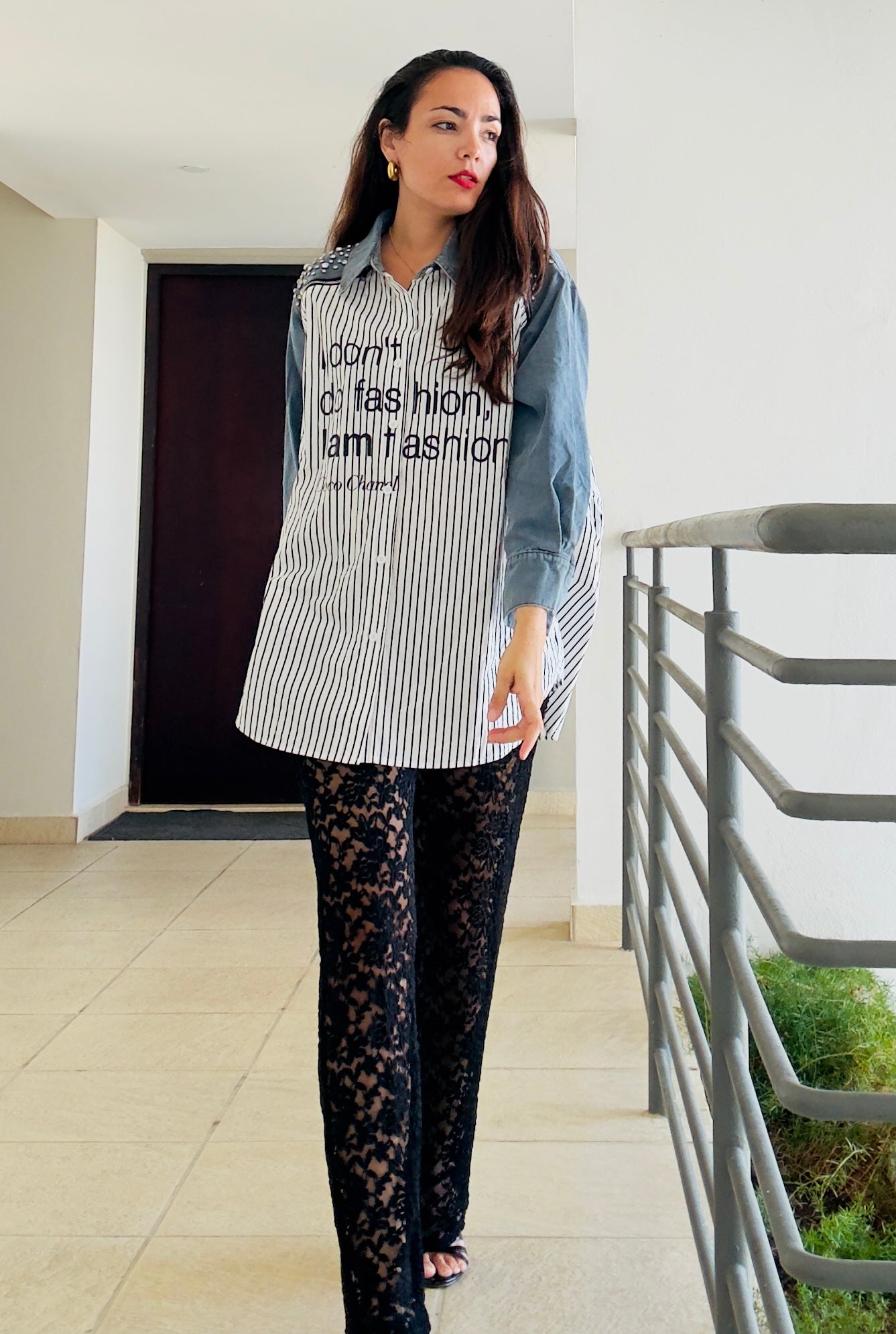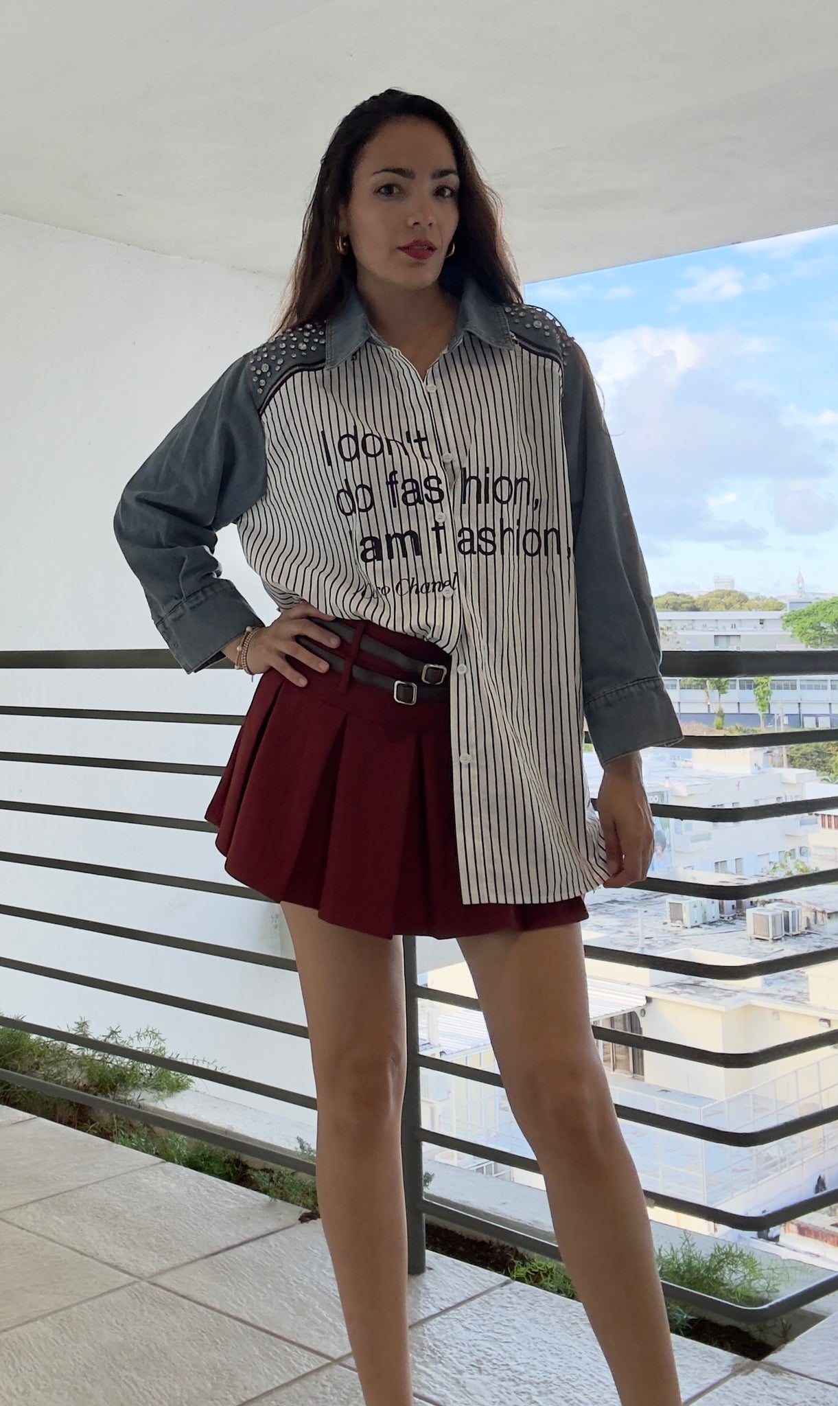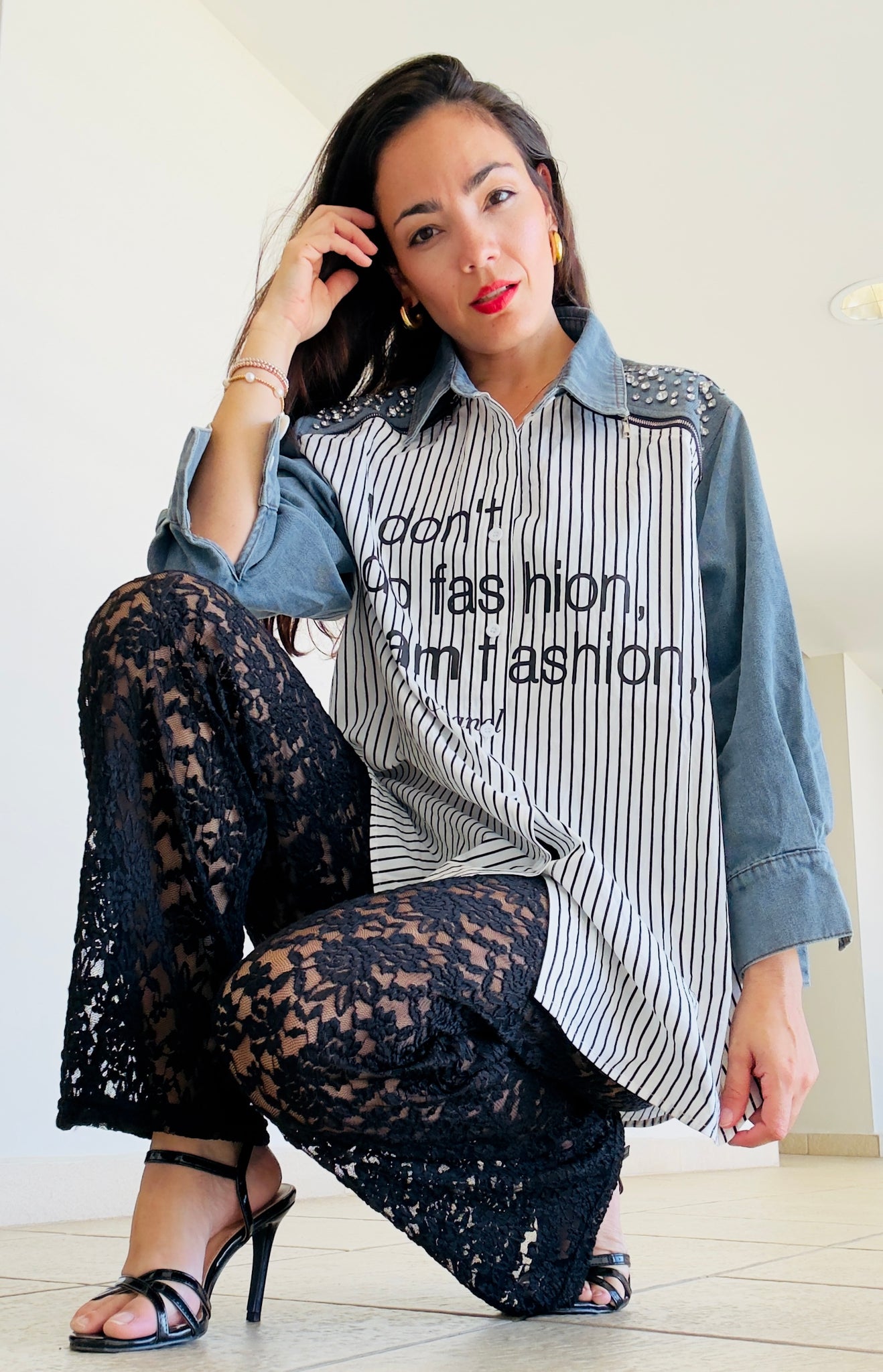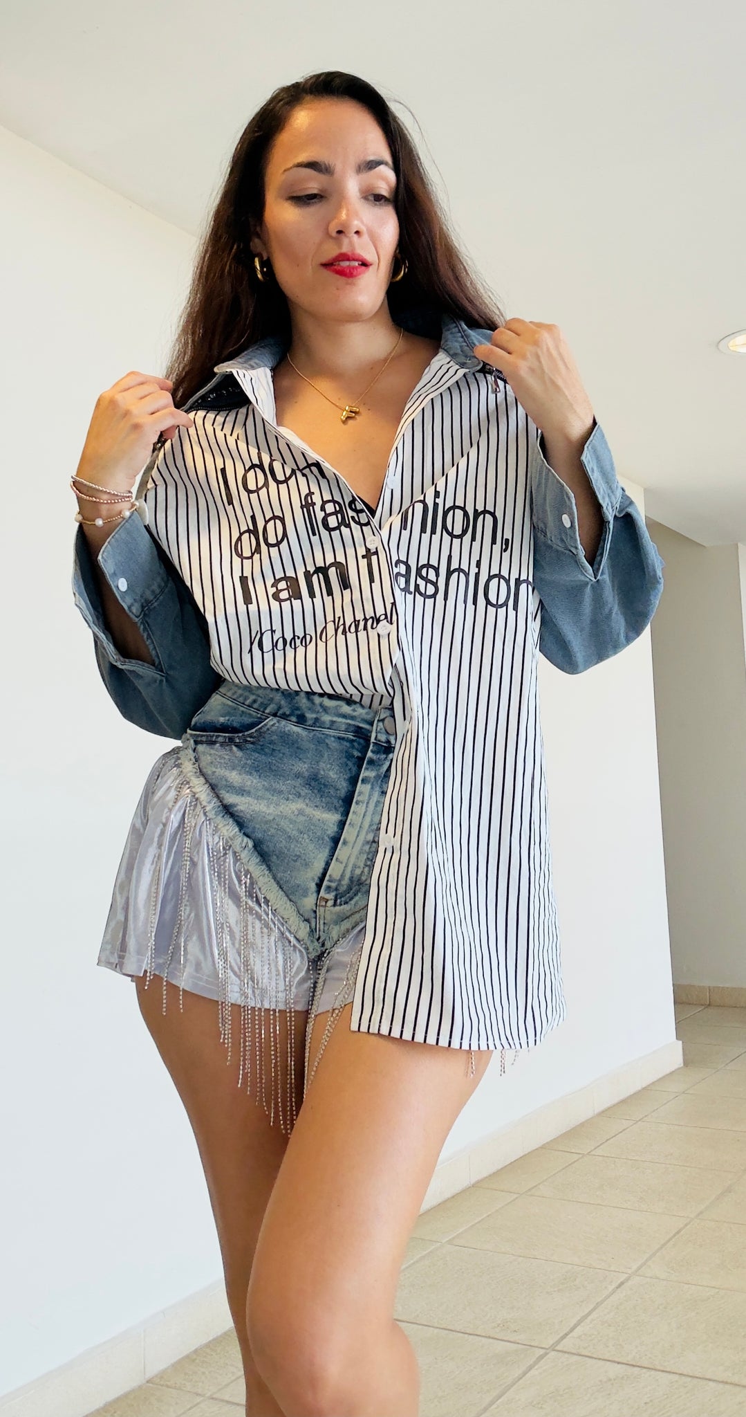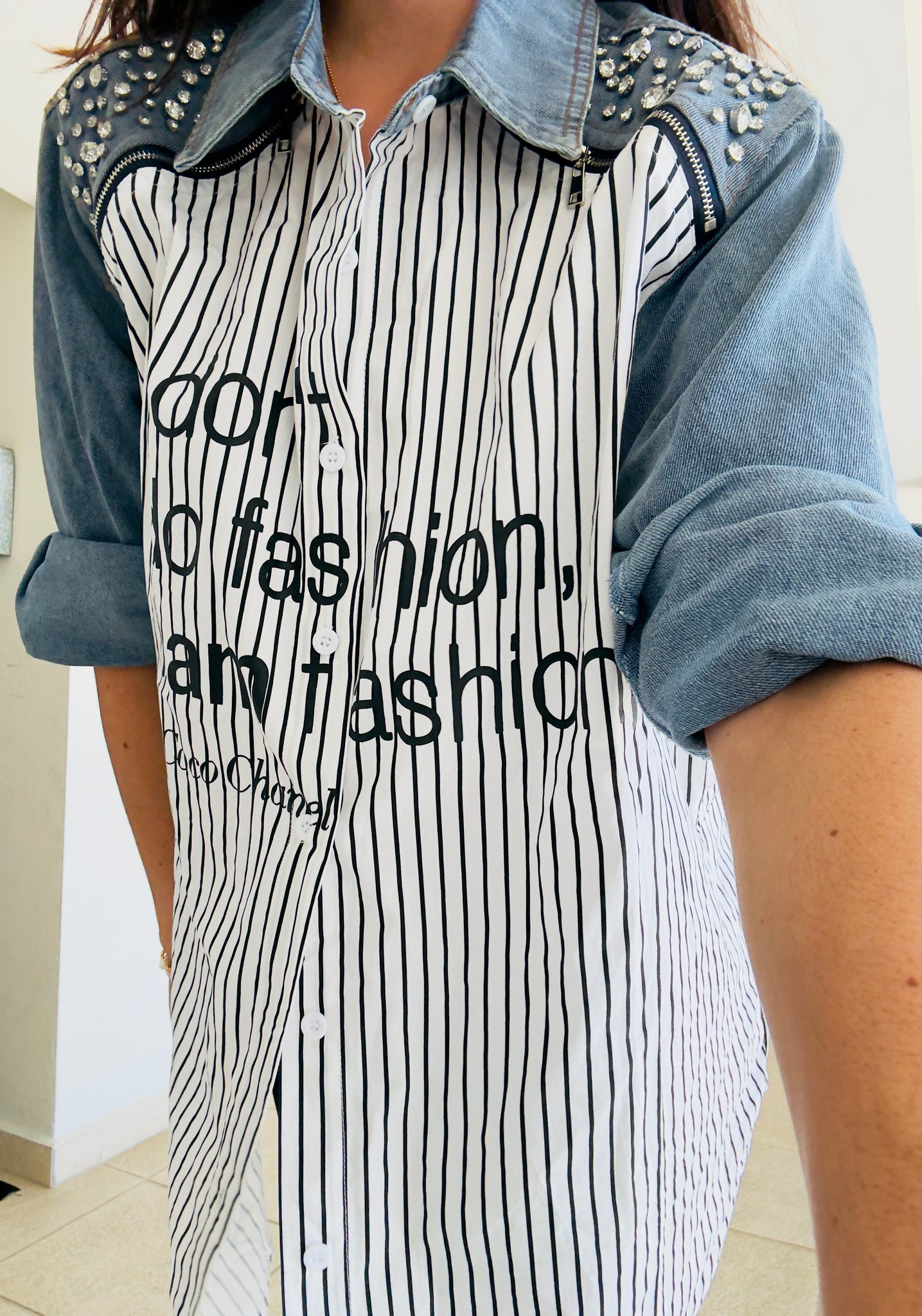 Stay stylish with our "I am fashion" top. This striped button top features a motivational quote from Coco Chanel and denim sleeves, shoulder, and neck. The shoulder also has a unique zipper and rhinestone details for added flair. Plus, the oversize look is both comfortable and trendy. Elevate your fashion game with this must-have top.