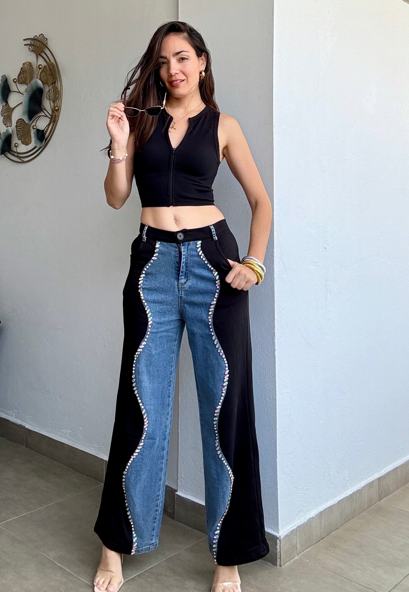 As an expert in the fashion industry, I bring you these beautifully designed Rhinestones Black and Denim Jeans. With a unique curves design, sewn rhinestones in the front, and two convenient pockets, these jeans are both stylish and functional. The elastic waist ensures comfort, while the black jersey on the sides adds a touch of elegance. Upgrade your wardrobe with these must-have jeans.